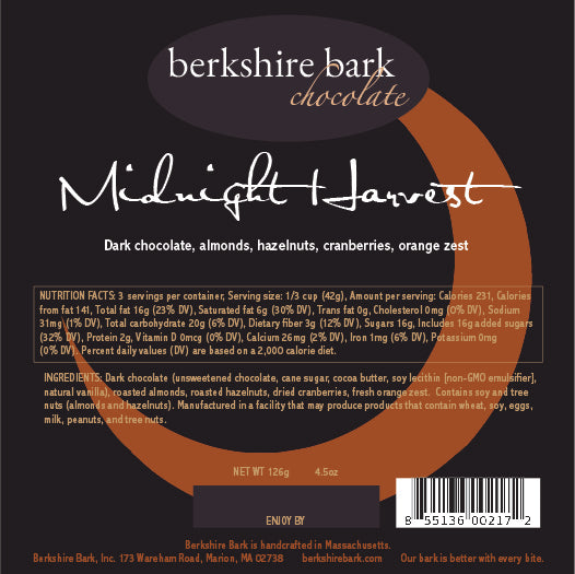 Dark Chocolate, Roasted Almonds, Roasted Hazelnuts, Dried Cranberries, Fresh Orange Zest